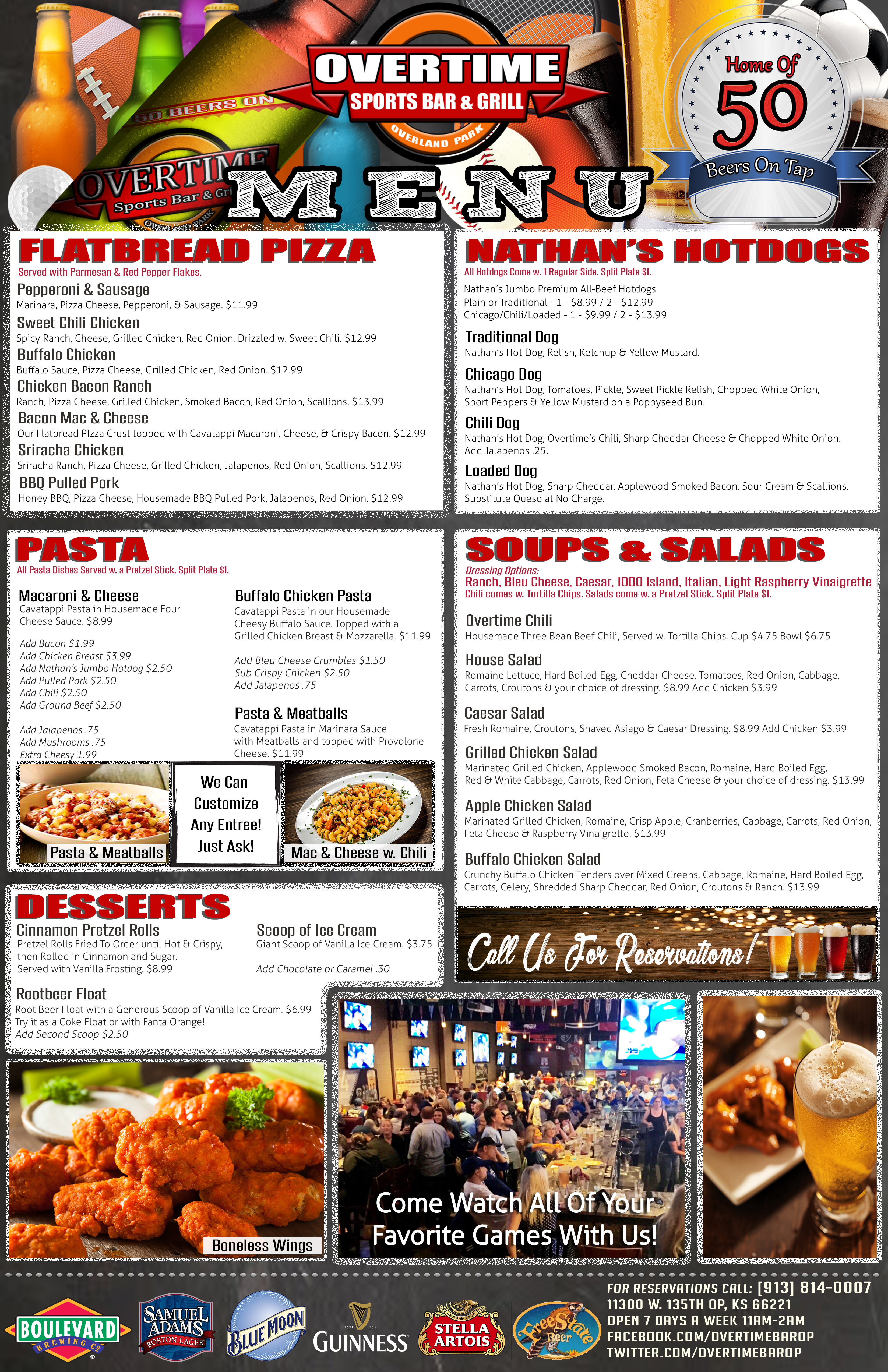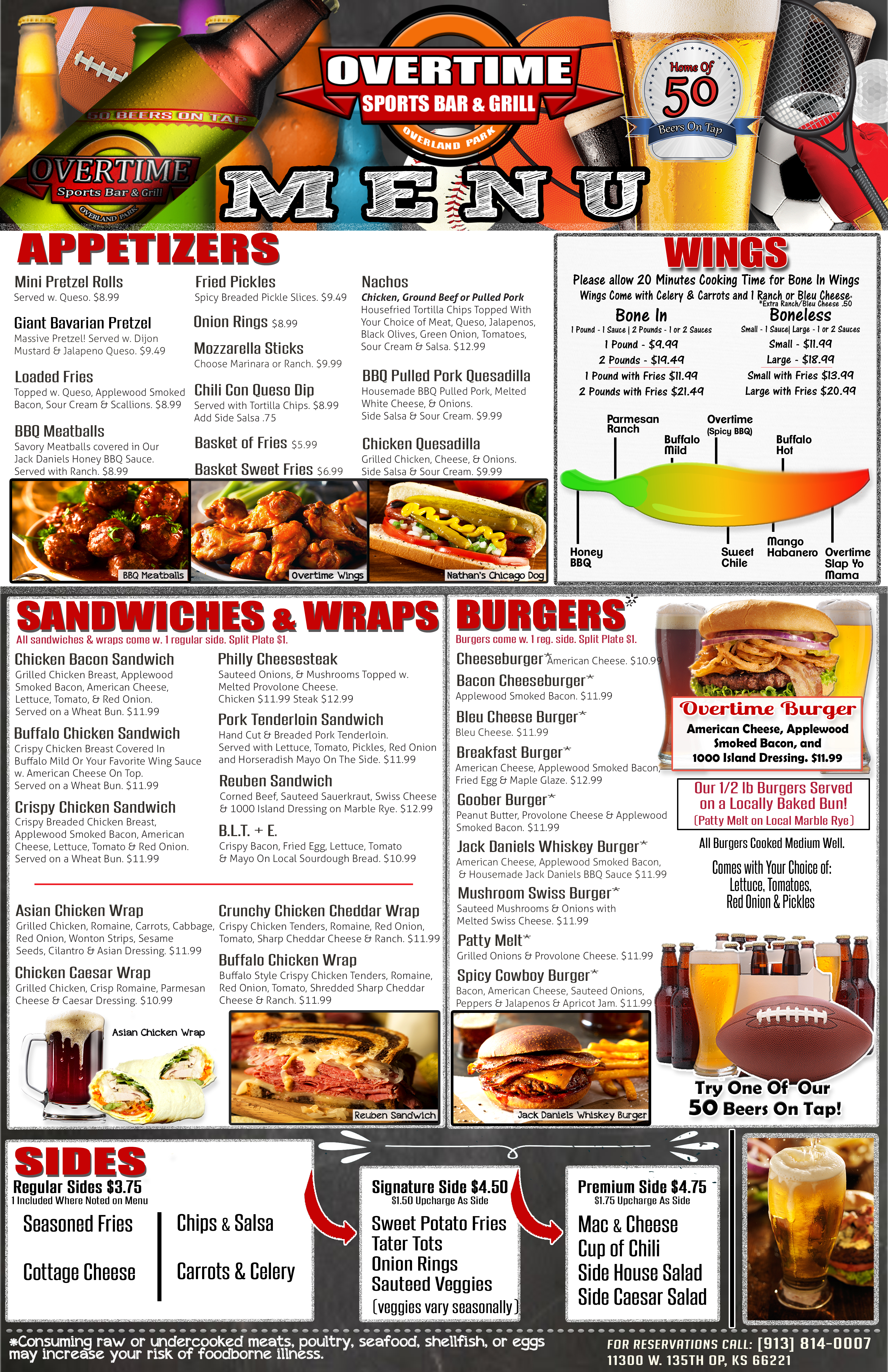 Overtime Menu Back jpg Download. For detailed hours of operation please contact the store directly. Delicious Drinks Great Food and a Friendly Atmosphere.